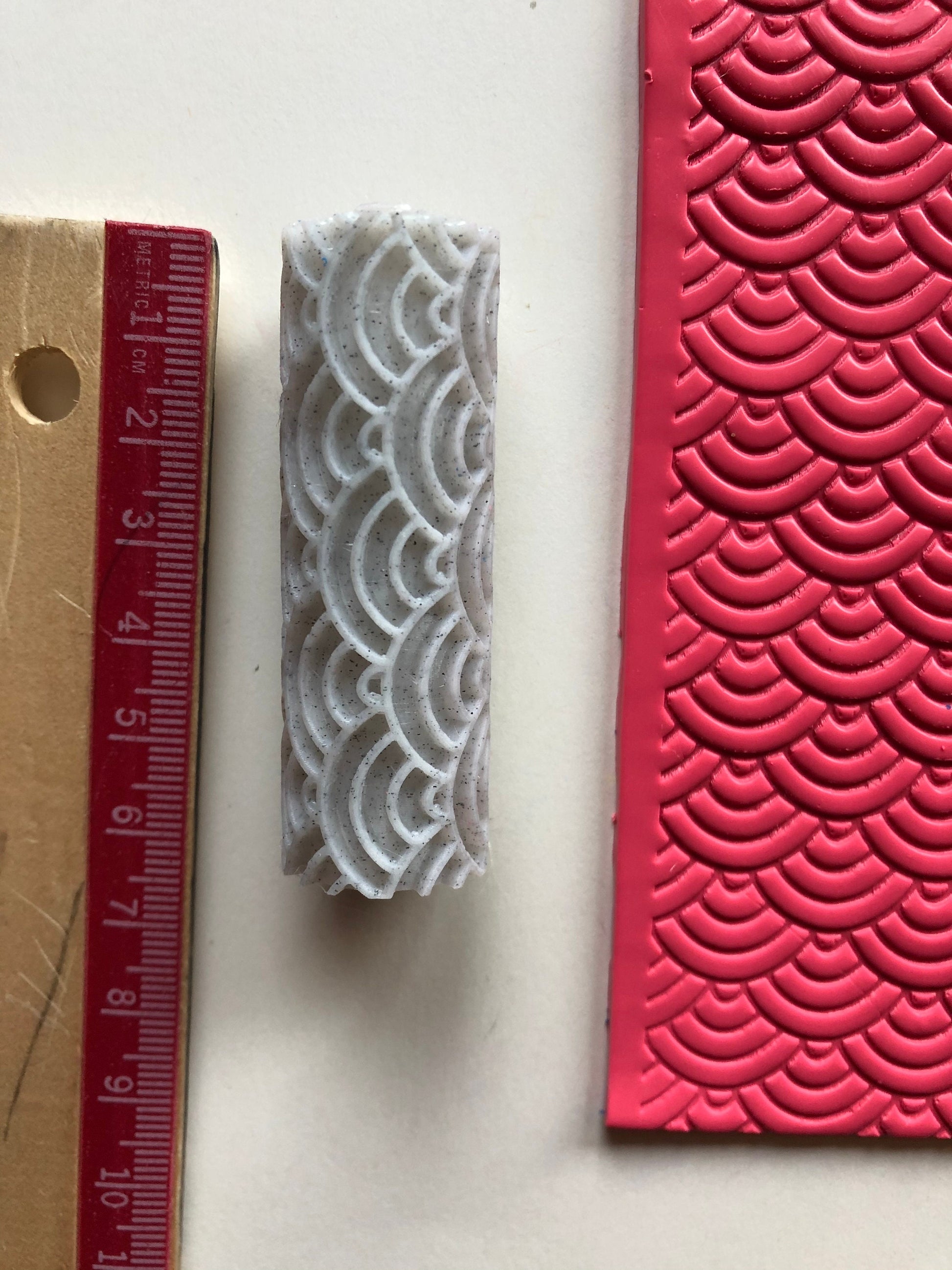 This is a roller designed to make an imprint in polymer clay. Printed with a 3D printer the design is 2mm deep for a good impression. The roller is 6cm tall and approx 2cm wide.