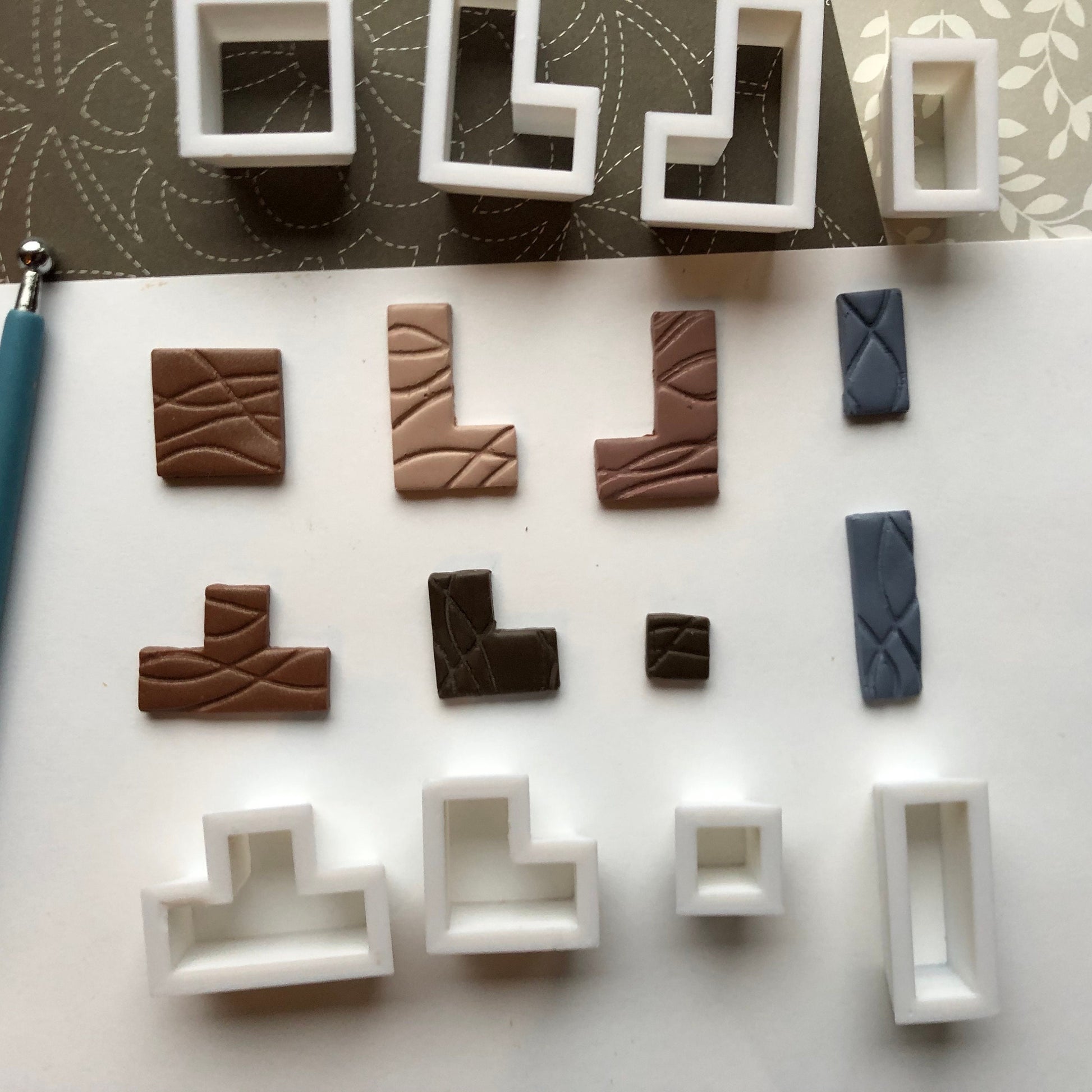 This is a set of eight cutters designed for use with polymer clay. Designed to fit together exactly, these can be use to design mosaics or even geometric earrings.