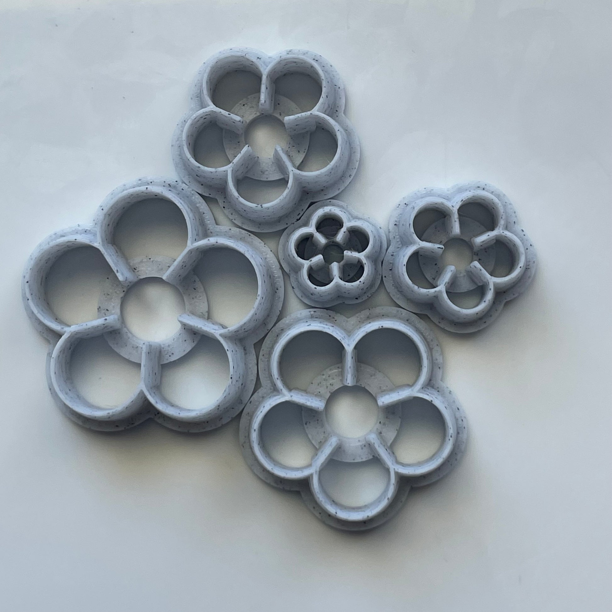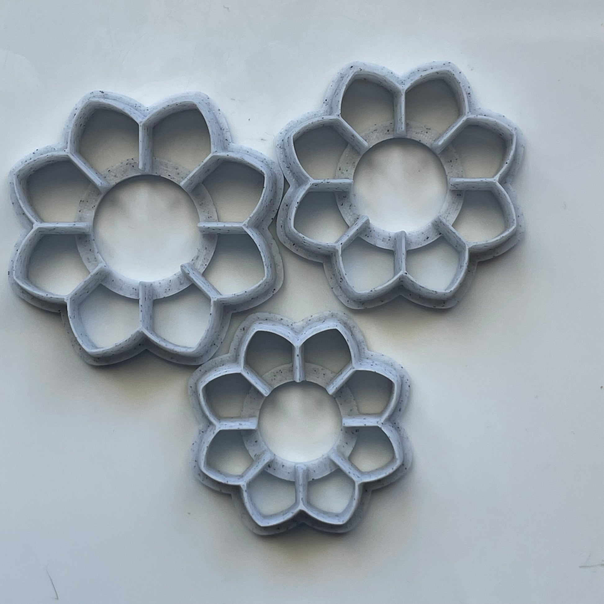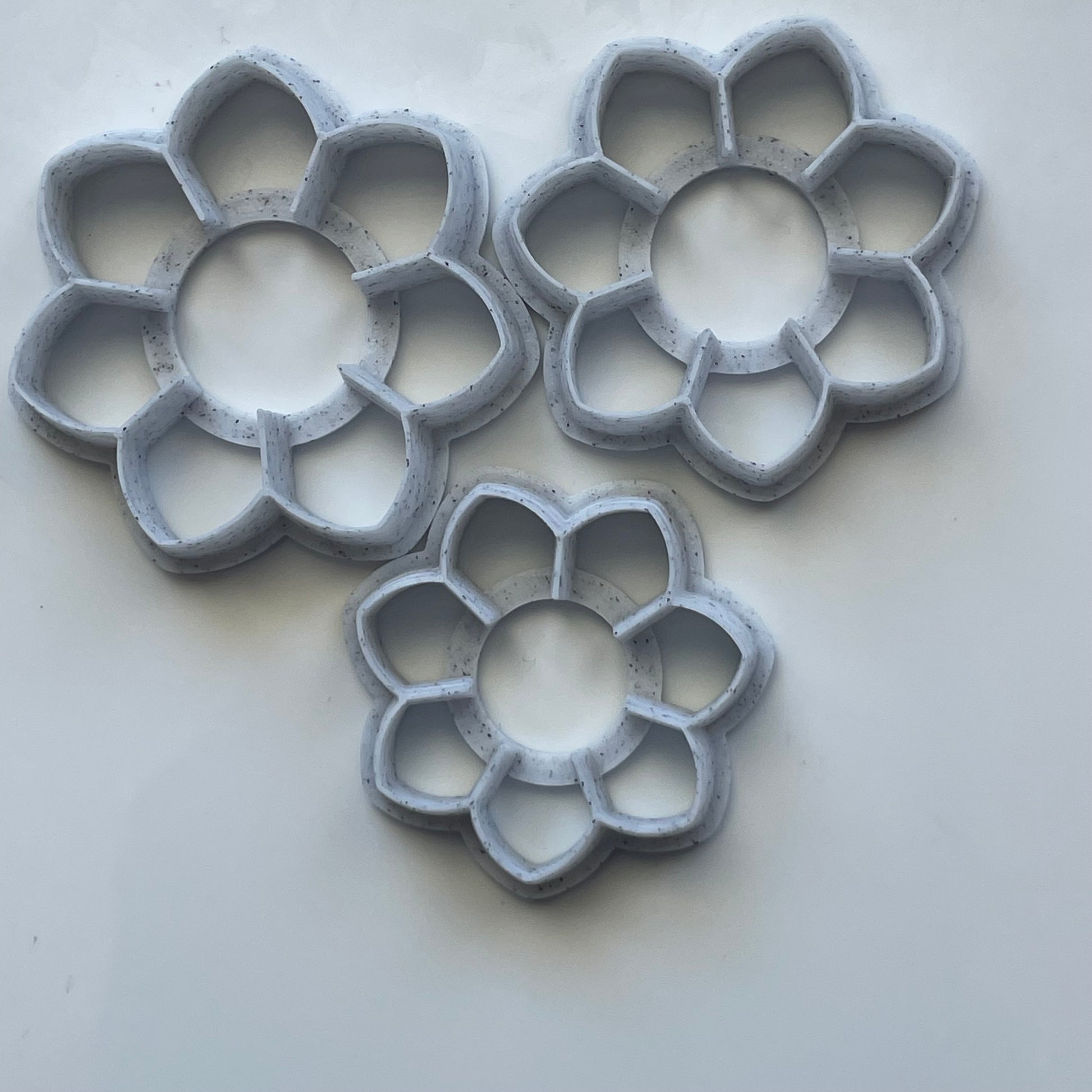 These flower cutters are designed to make layered flowers. Printed with a 3D printer, they are tapered to a sharp edge for a clean cut.