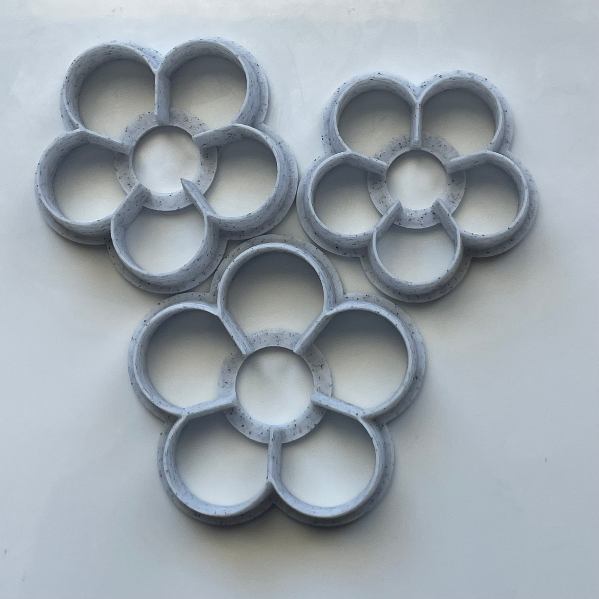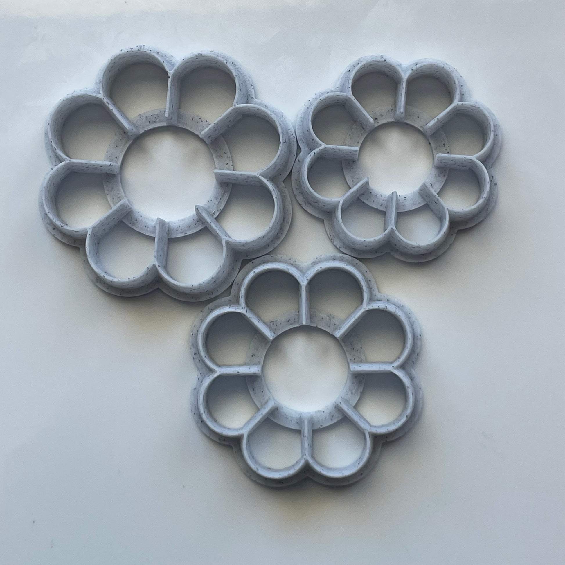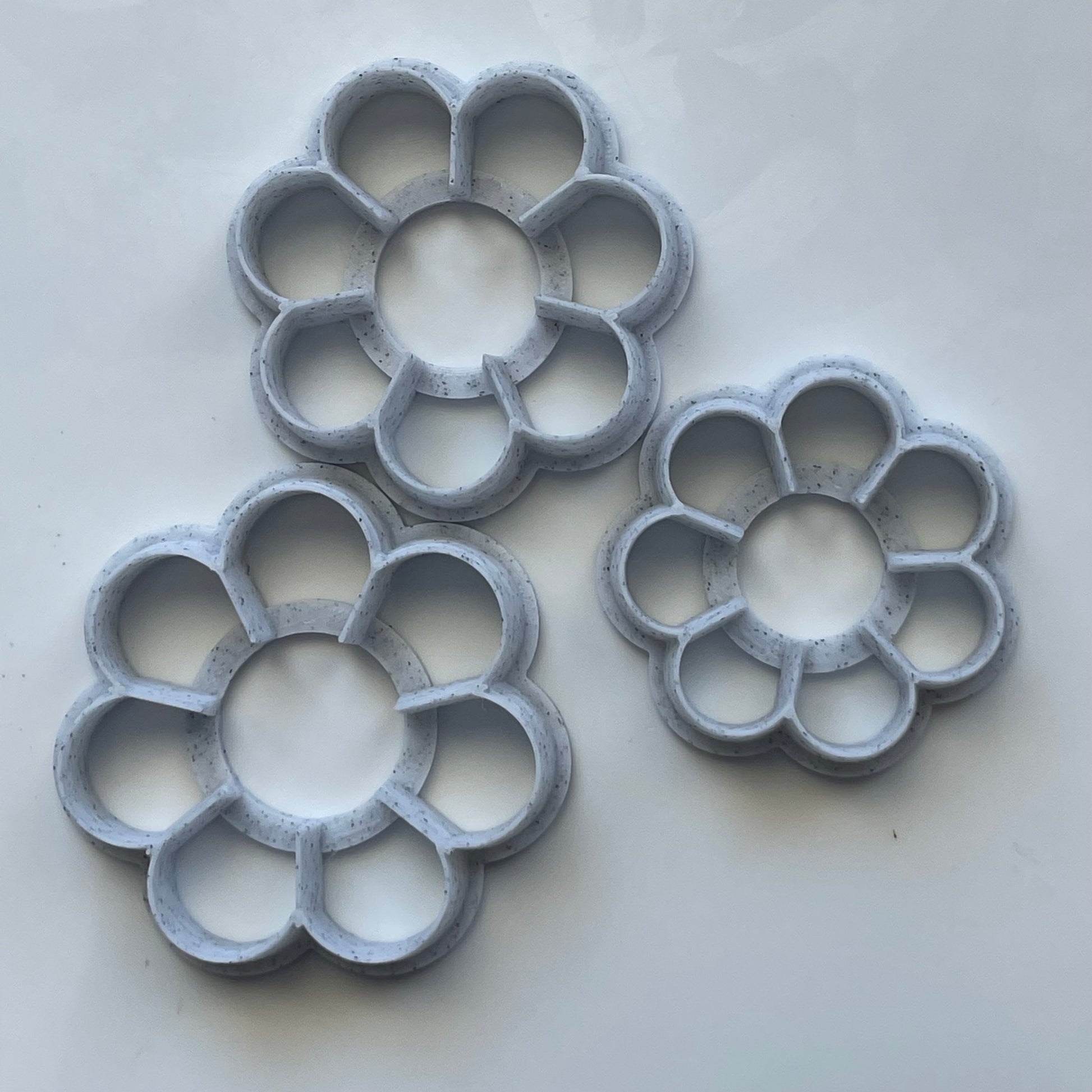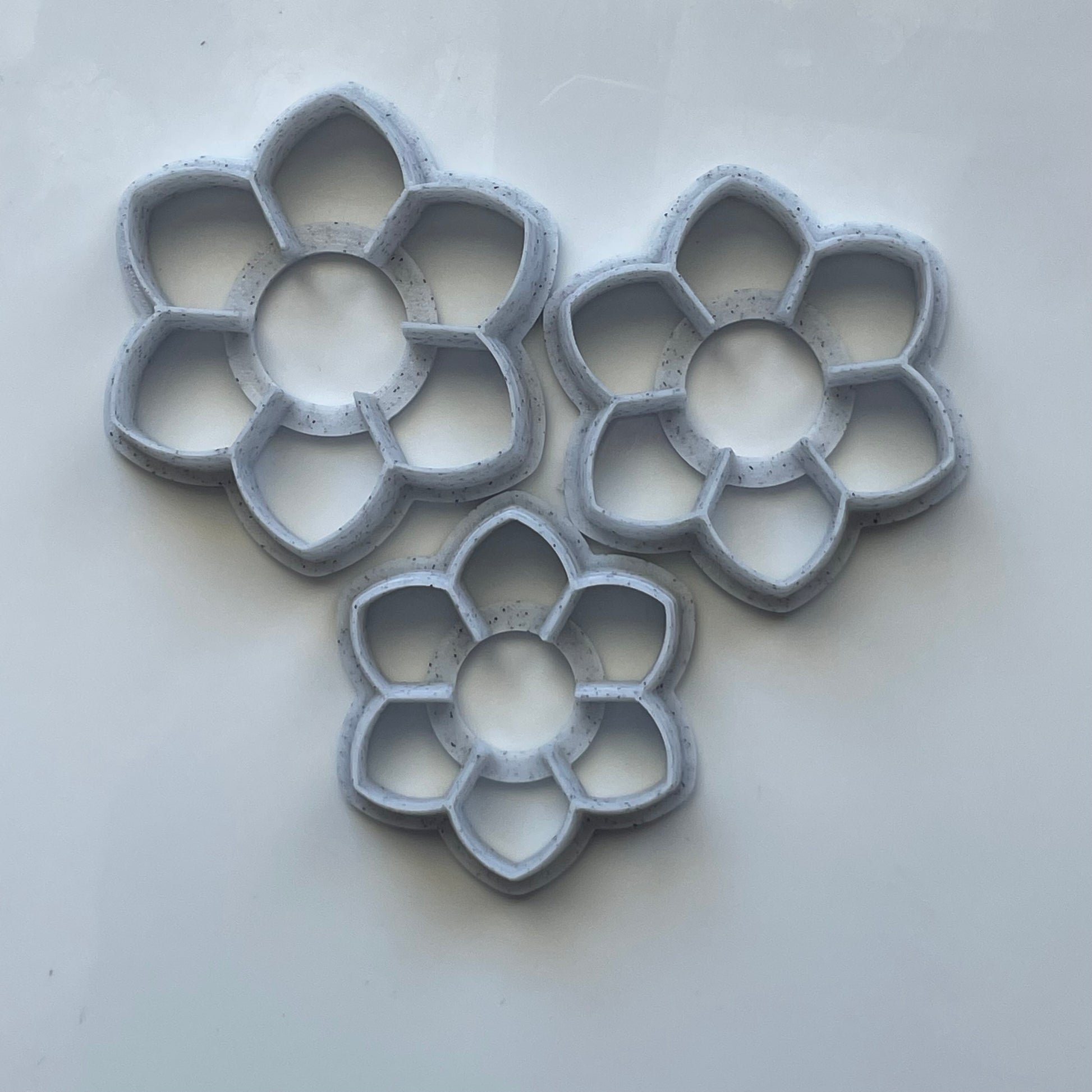 These flower cutters are designed to make layered flowers. Printed with a 3D printer, they are tapered to a sharp edge for a clean cut.