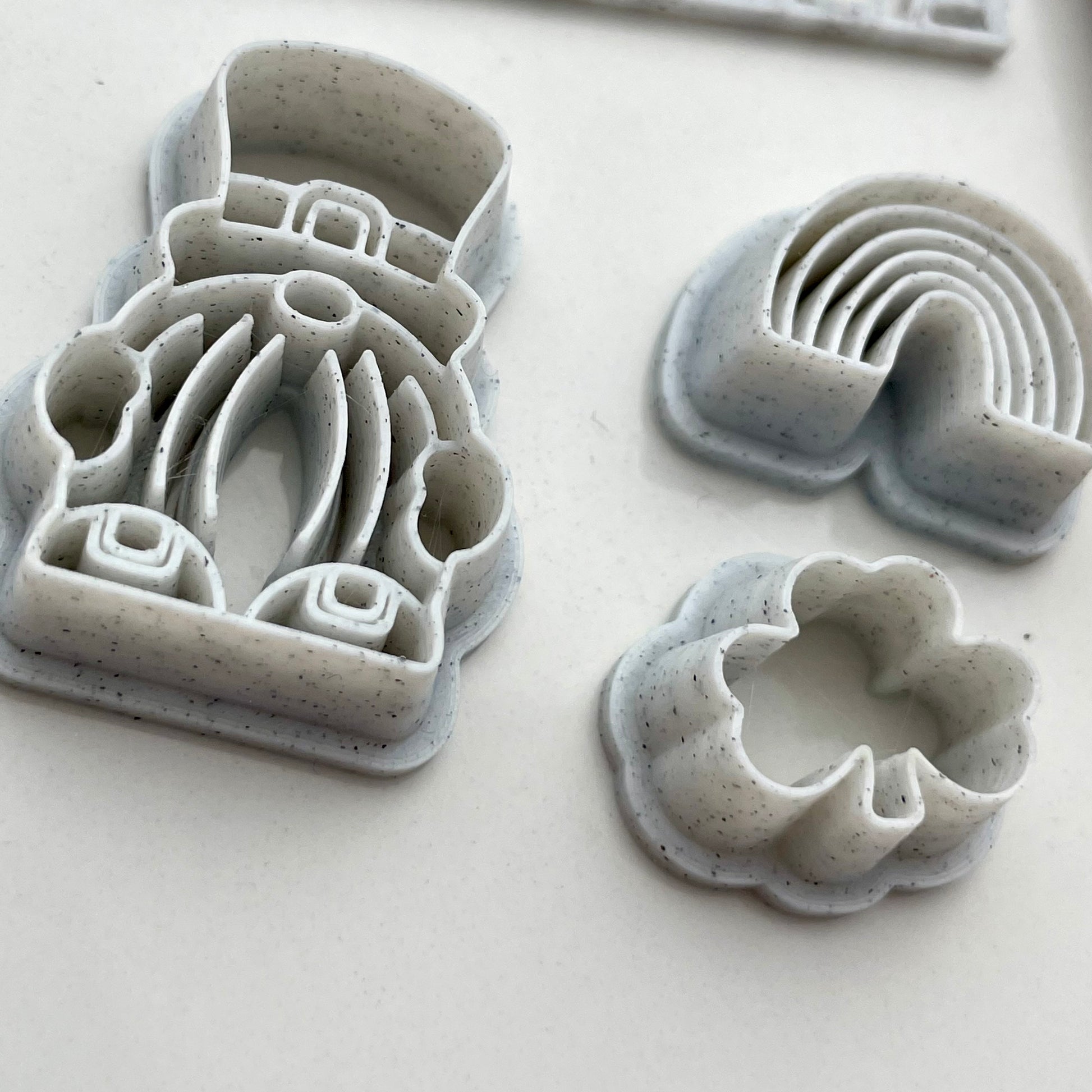 This is a set of three cutters, the leprechaun cutter as well as the rainbow cutter and clover cutter. The leprechaun cutter works well with 3mm clay but the rainbow cutter has been designed to work with thinner clay (around 2mm).