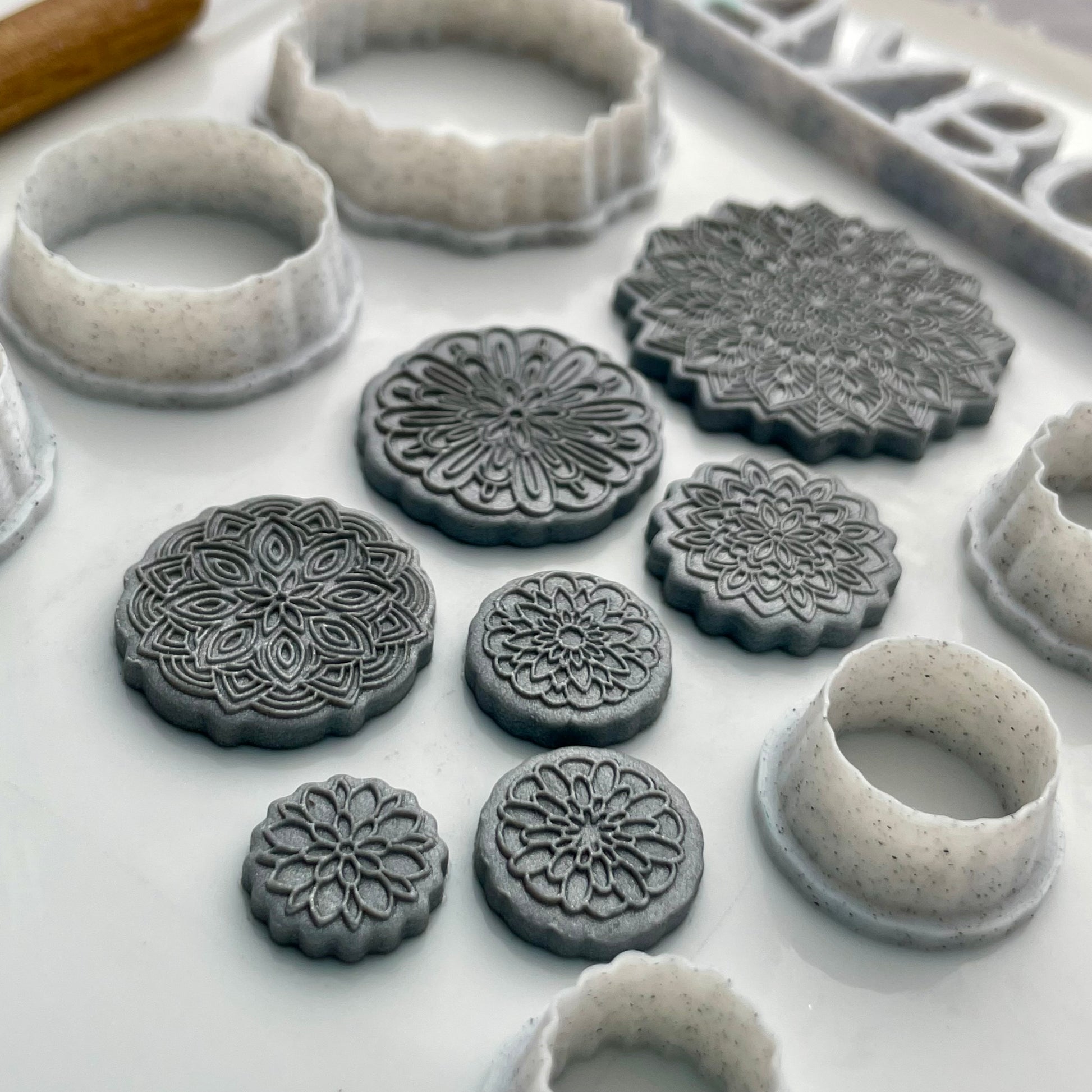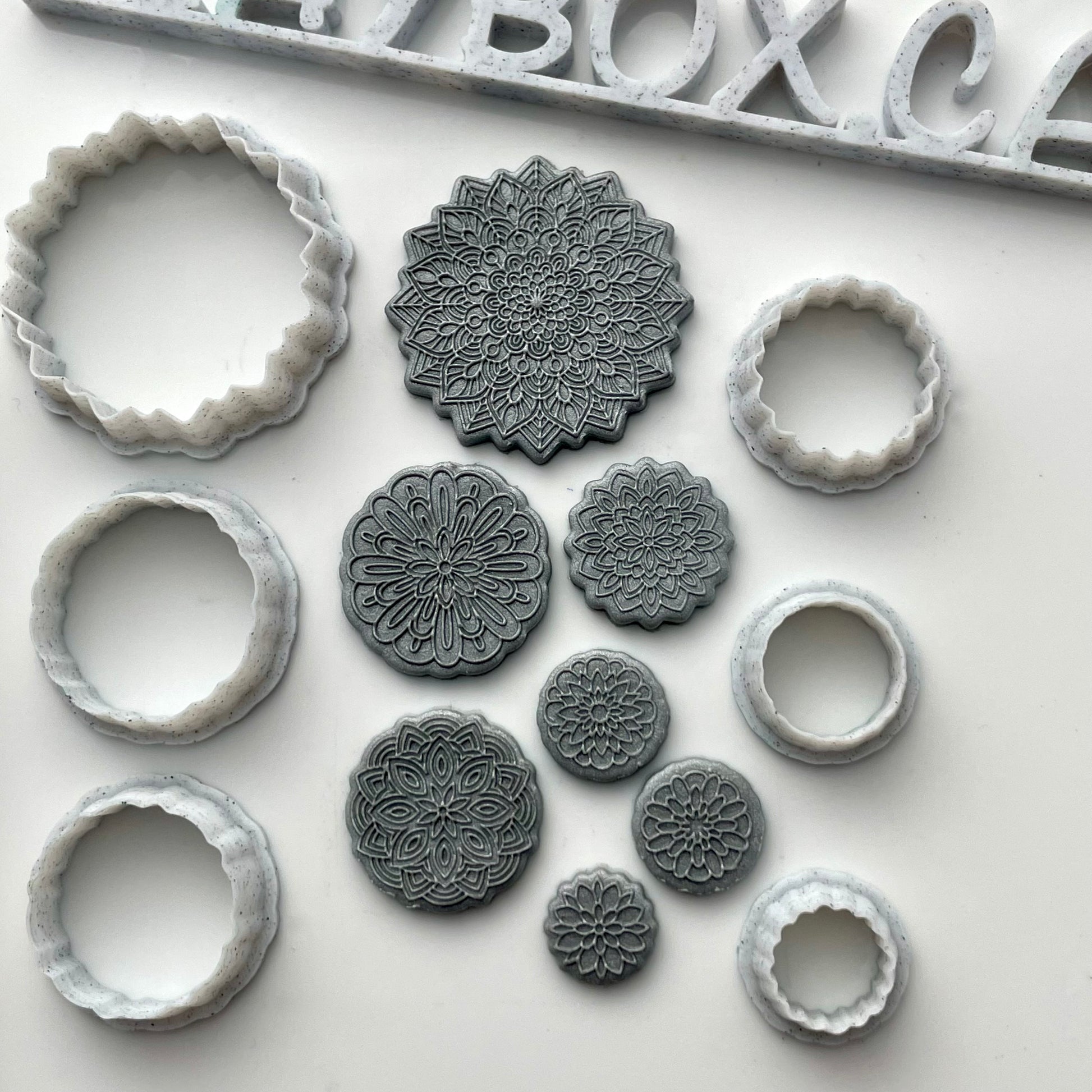 The matching cutter set has six cutters sized 3.7cm (~1.5") down to 1.3cm (~0.5"). Two of the smaller mandalas use the same cutter.