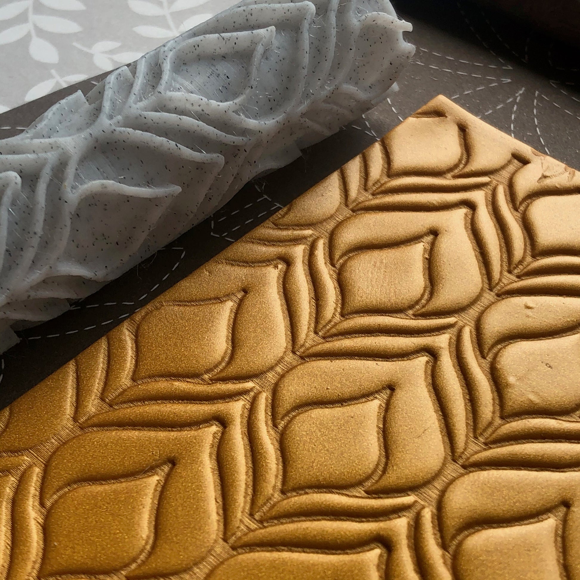 This is a roller designed to make an imprint in polymer clay. Printed with a 3D printer the design is 2mm deep for a good impression. The roller is 8cm tall and approx 2cm wide.