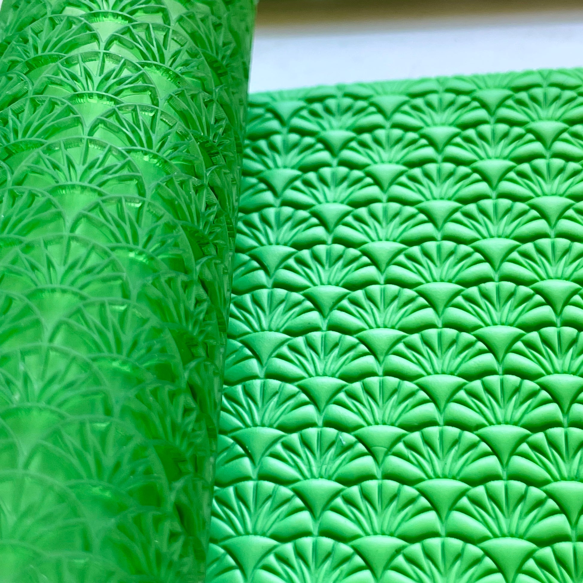 This is a roller designed to make an imprint in polymer clay. Printed with a 3D printer the design is 1.2mm deep. The roller is 9cm(3.5") tall and approx 2.5cm(1") wide.