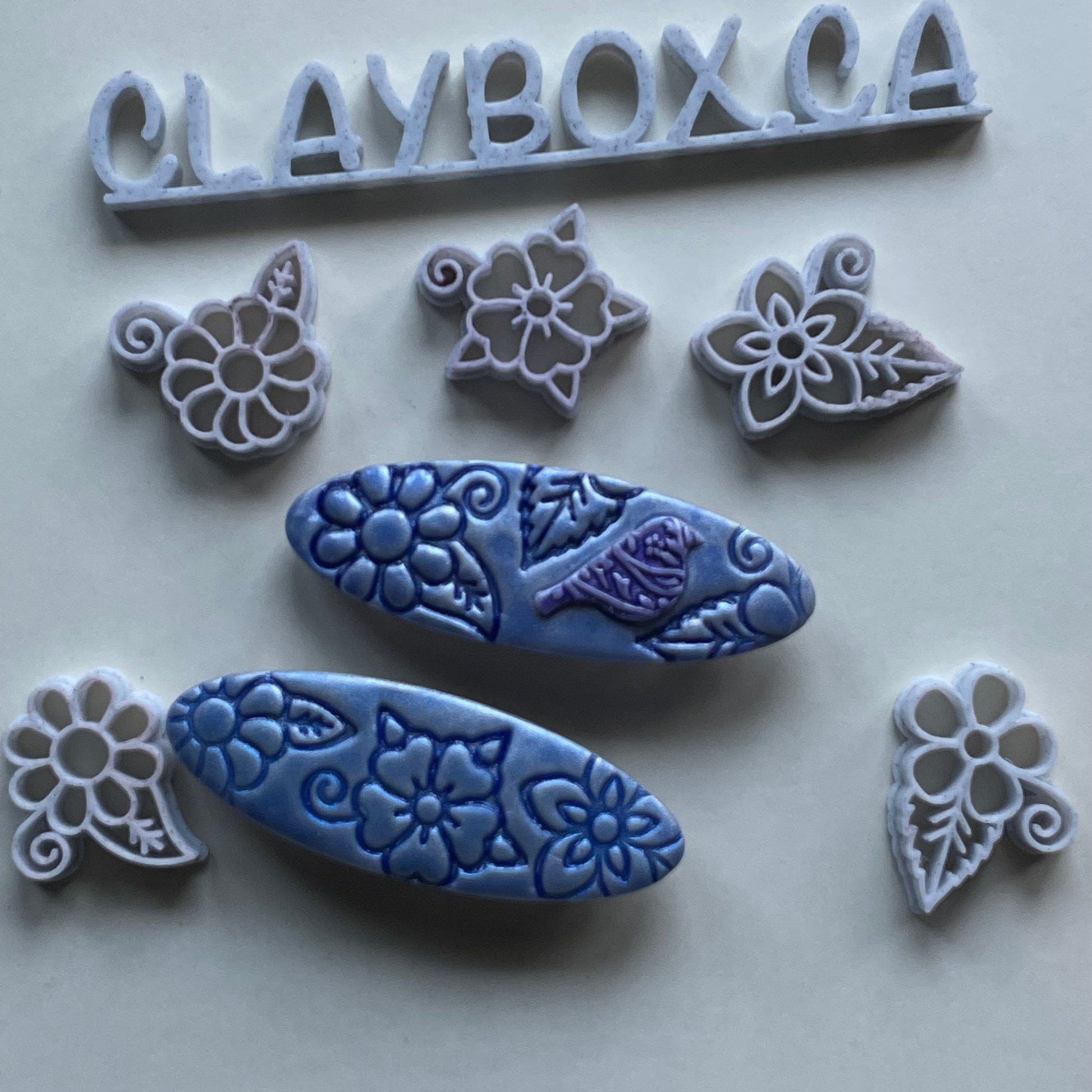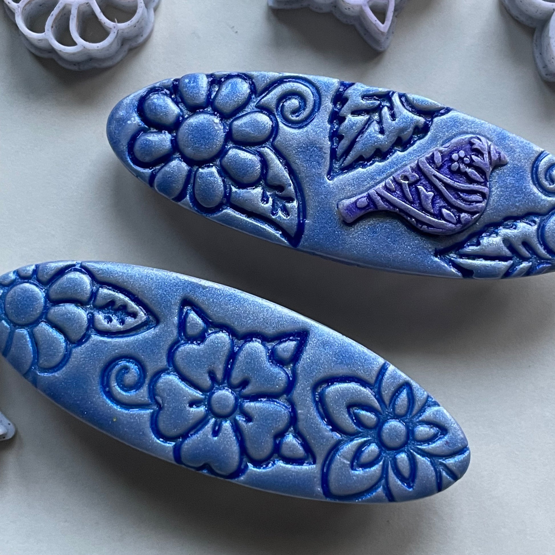 This is a set of five flower stamps, larger and thicker than my usual stamps, these work well on barrettes as shown in these pics.