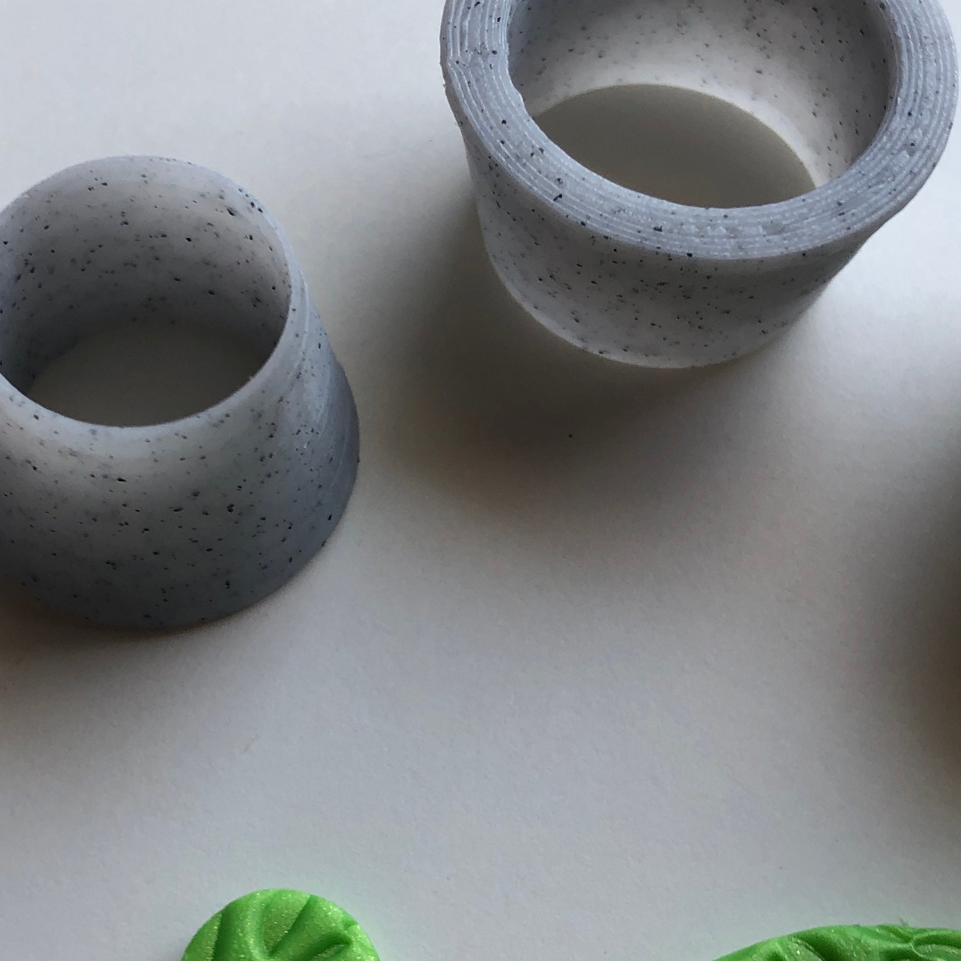 This is a set of circle cutters. Designed for polymer clay and printed with a 3D printer, they taper to a sharp cutting edge for a cleaner cut.
