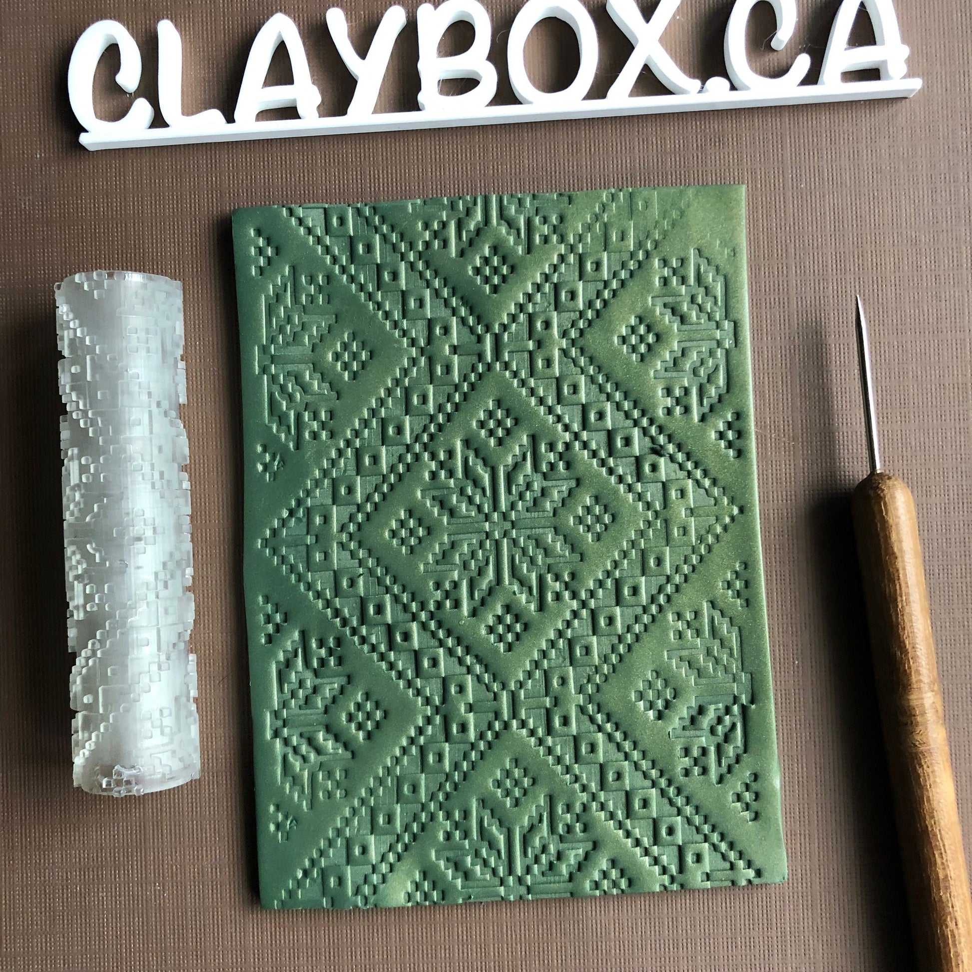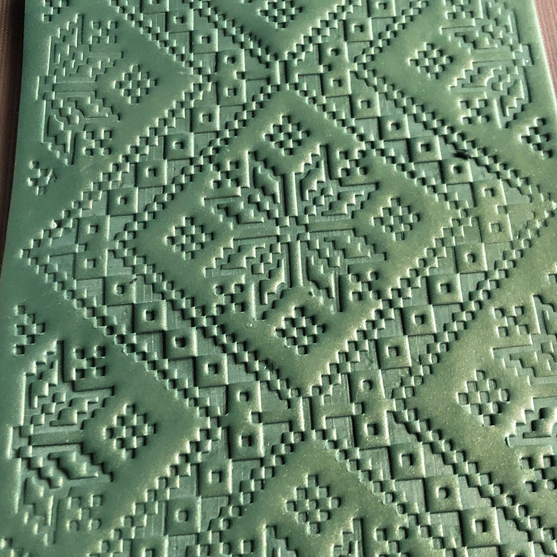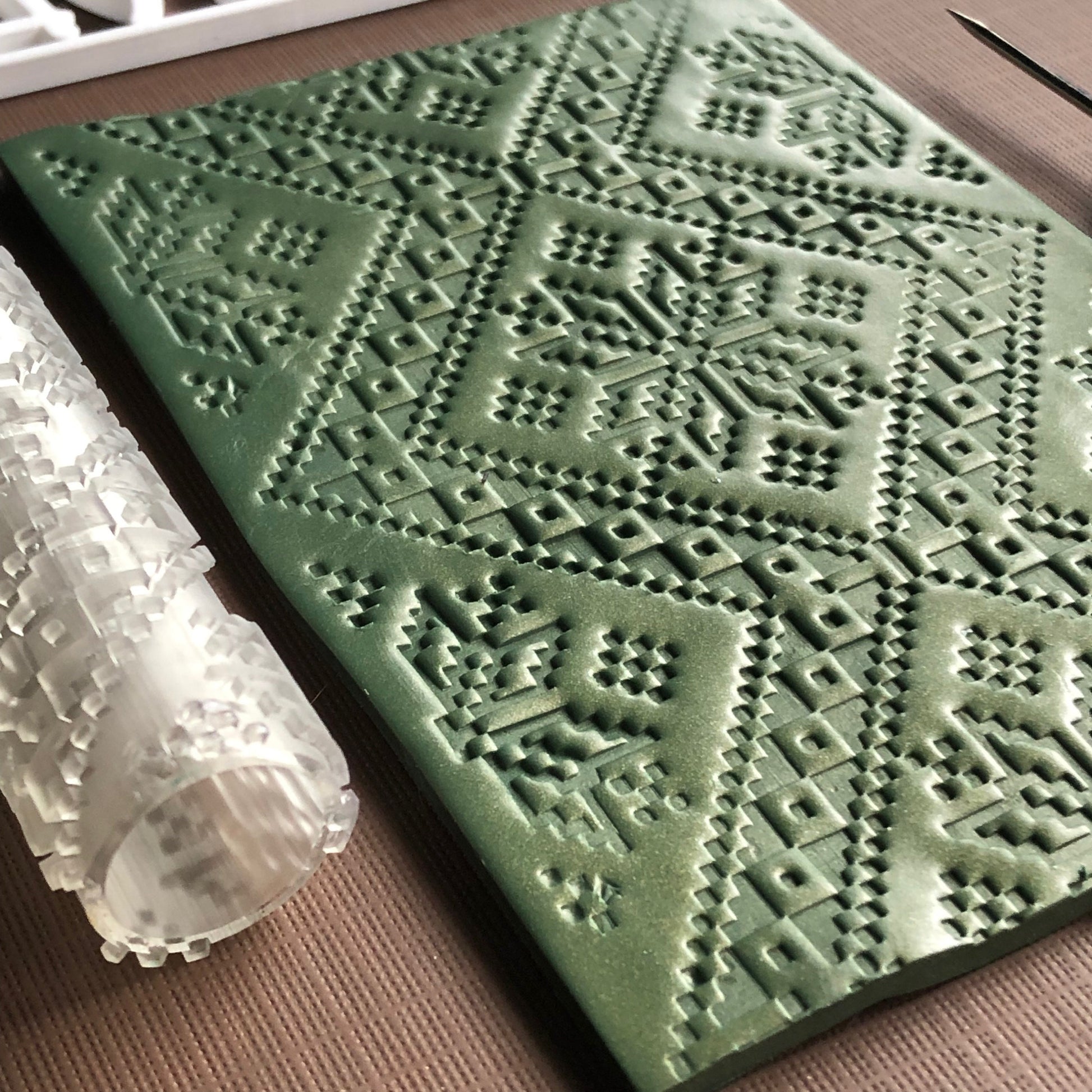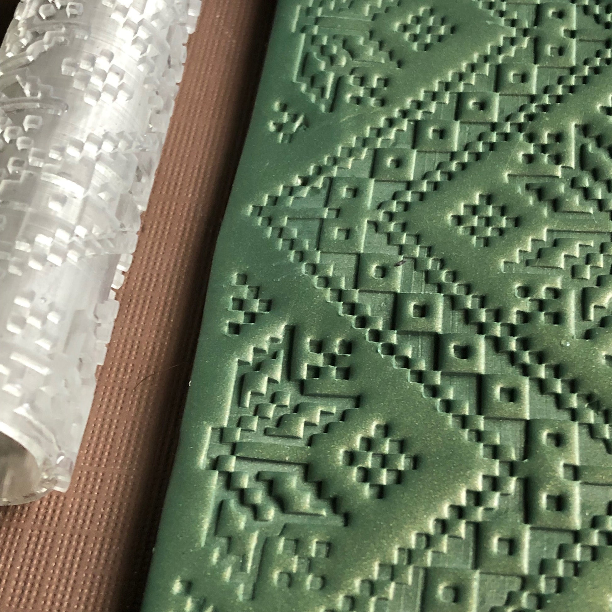 This is a roller designed to make an imprint in polymer clay. Printed with a 3D printer, the design is 1.2mm deep. The roller is approx 8cm tall and approx 2cm wide.