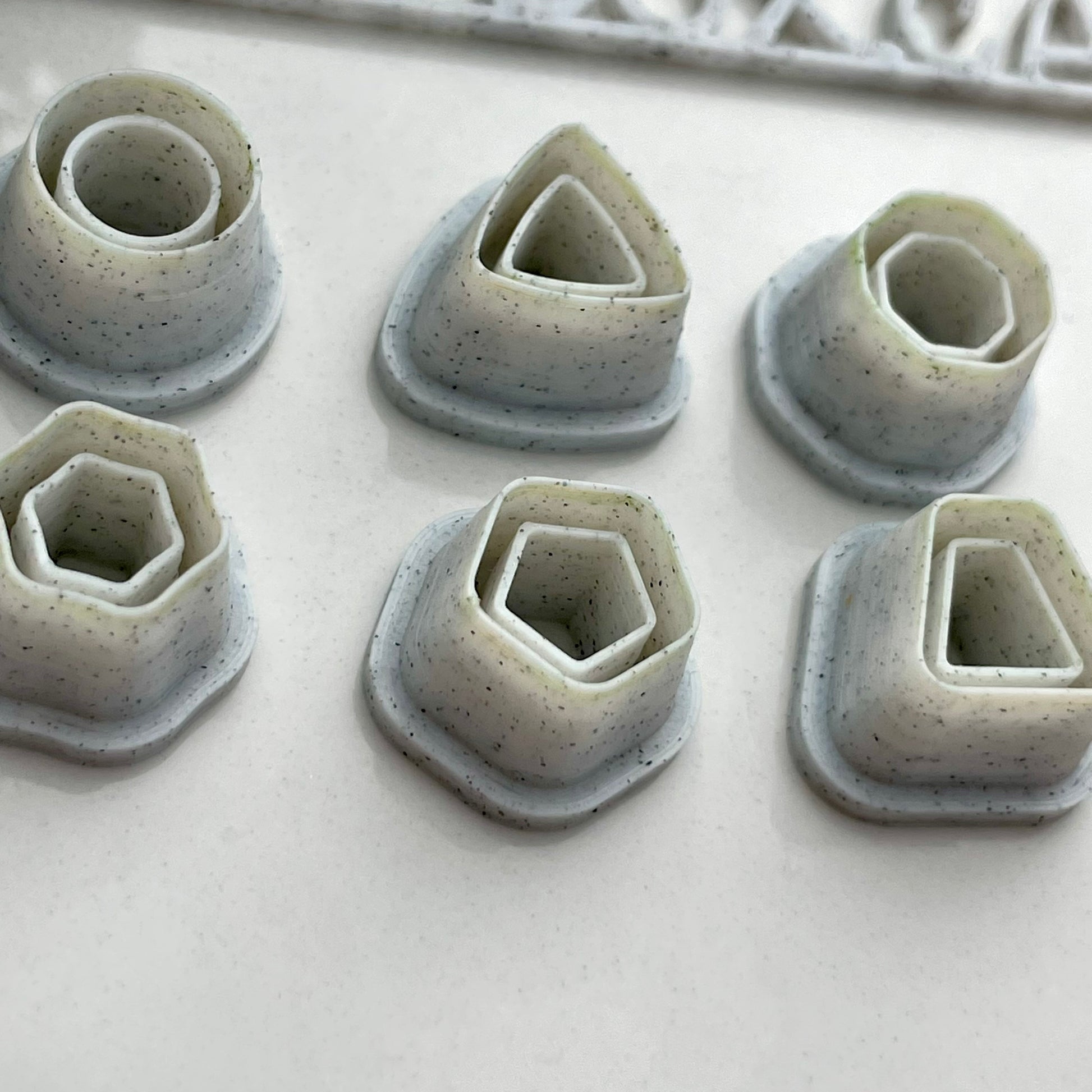This is a set of six small cutters designed specifically for making stud earrings. These work well with 3mm clay. Some kind of release is required to stop clay sticking in these.