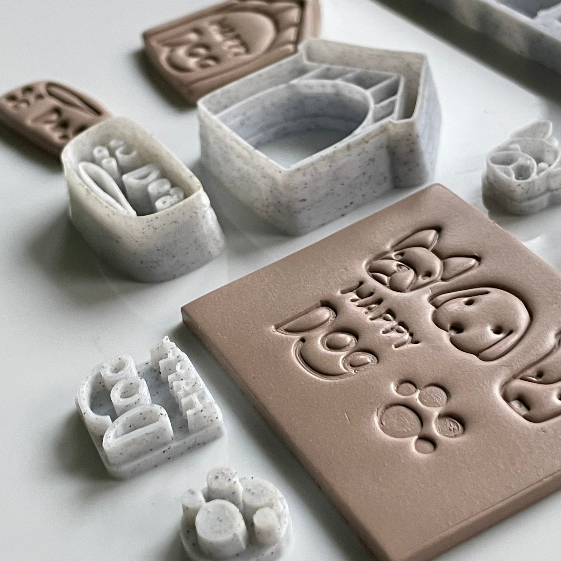 This is a set of two stamp cutters and five stamps. The stamps are designed to fit inside the dog house door. The dog house is approx 3cm tall and the dog bowl is 2.5cm (1") wide