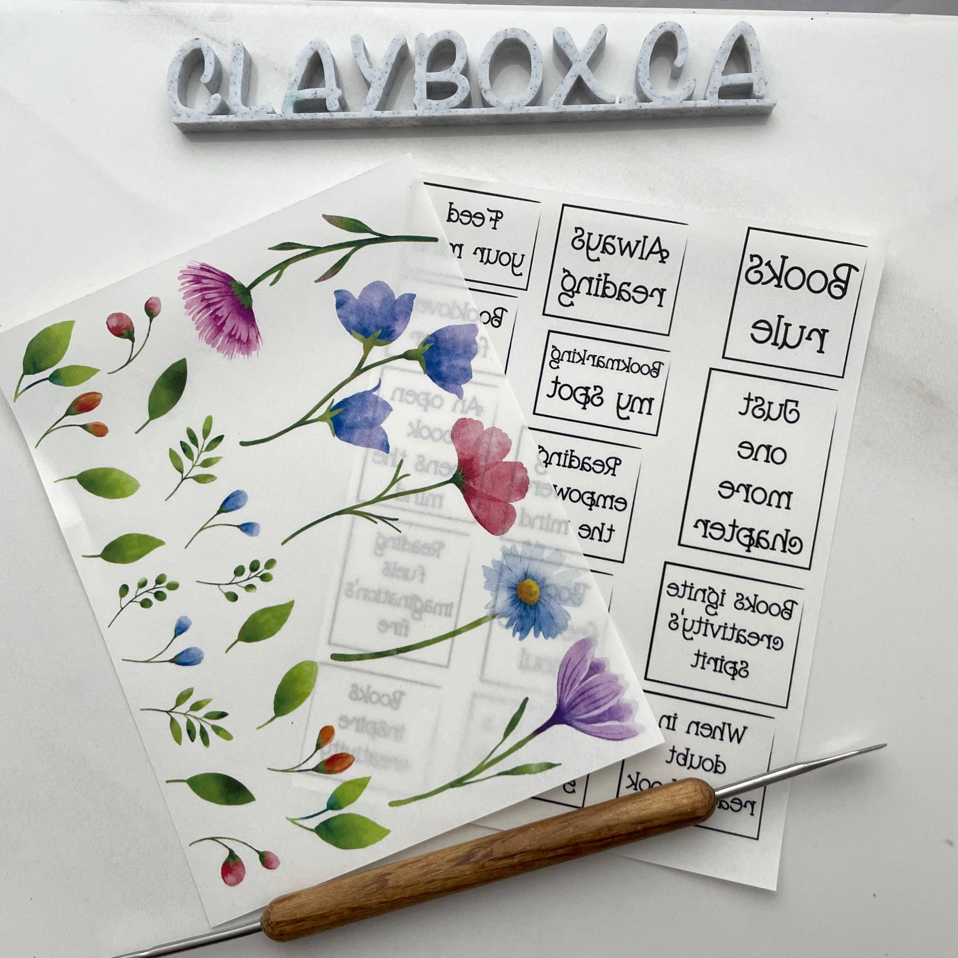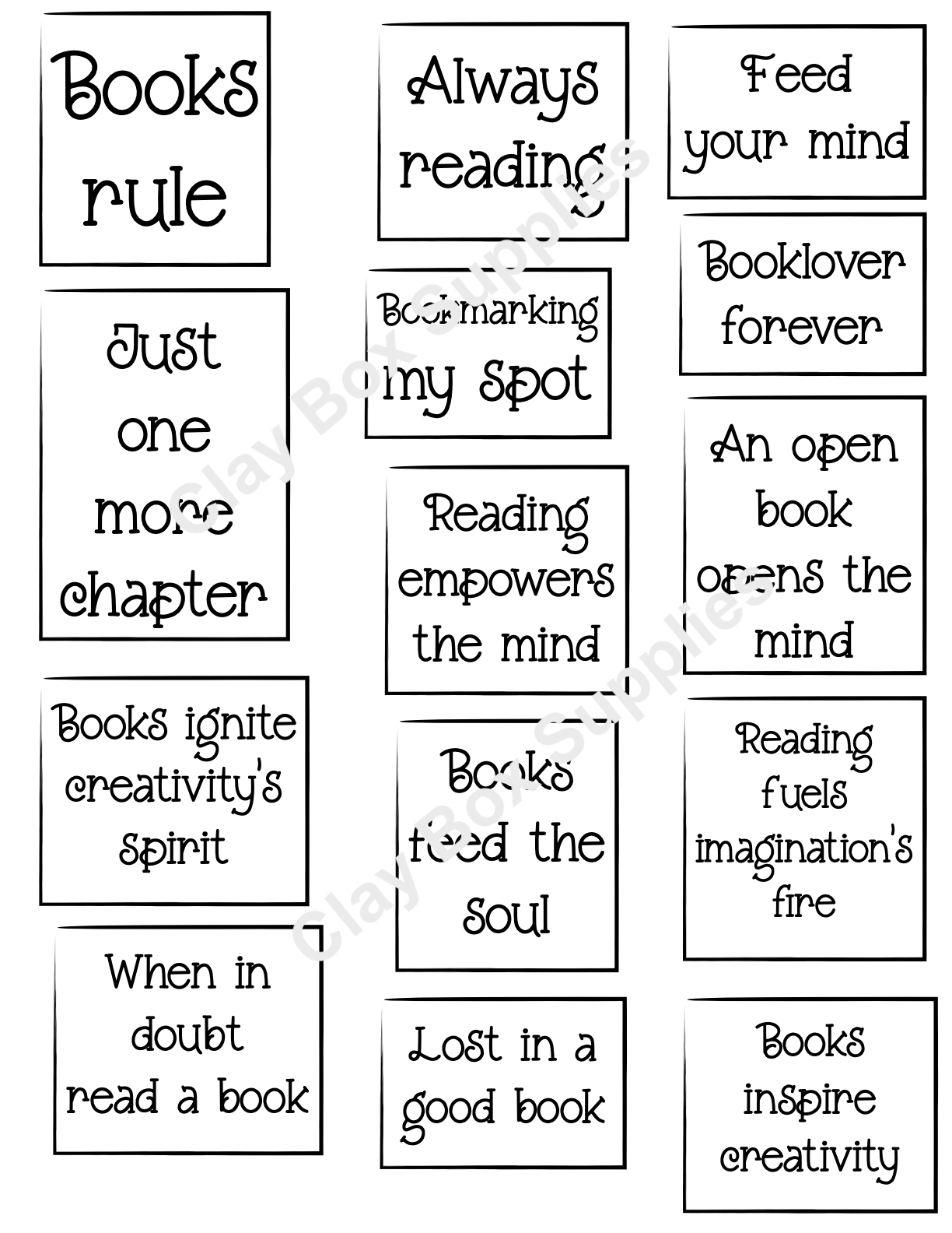 Designed to be cut out and used for polymer clay bookmarks the largest flowers are approx 6cm (~2.5") x 3cm (~1.25). The word boxes are all widths less than 3cm (~1.25)