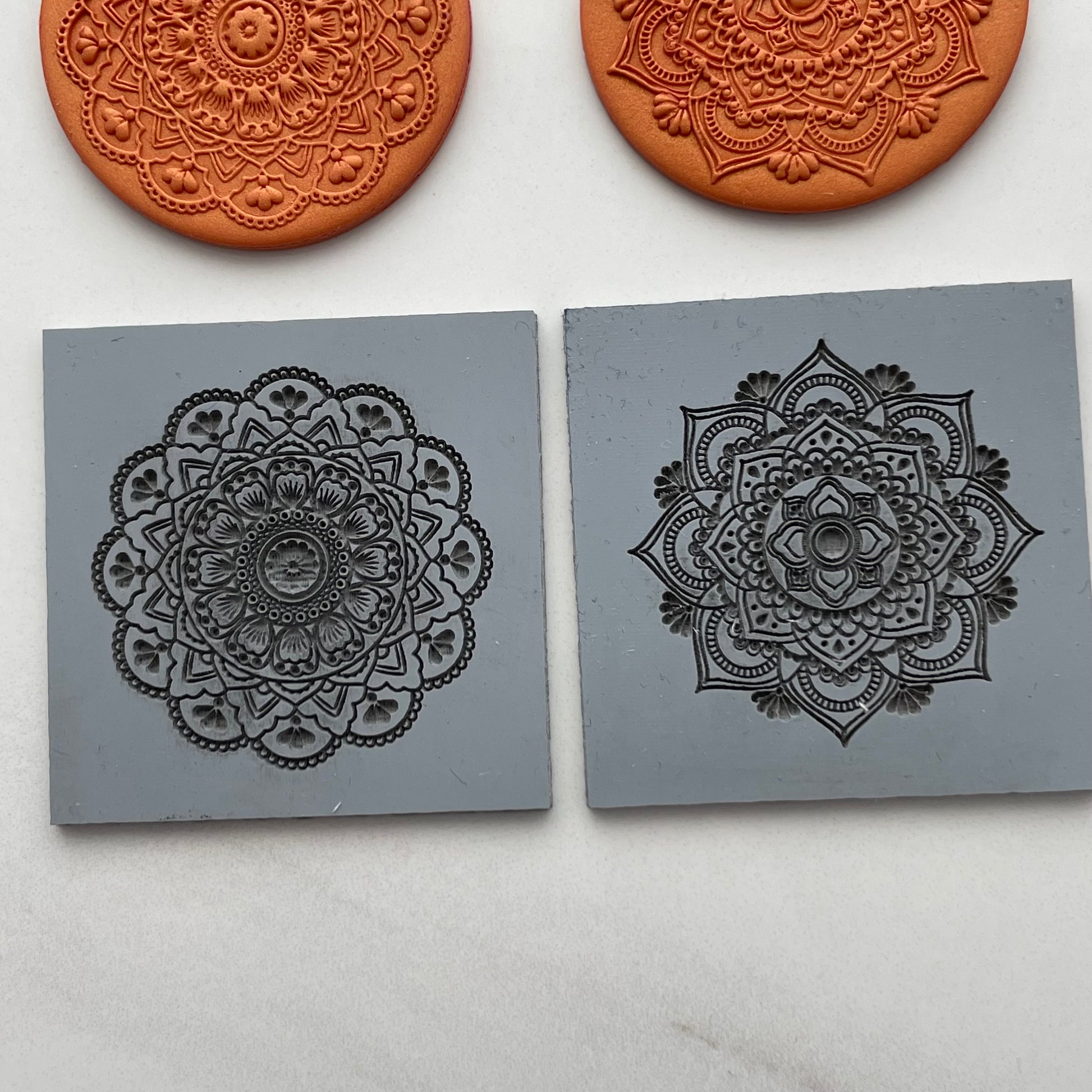 This is a pair of rubber texture mats, each is sized 2" x 2" and the mandalas are sized 4cm (approx 1.5"). Laser engraved to create a finely detailed texture stamp. Press into your clay and then roll over firmly in one pass for the deepest impression.