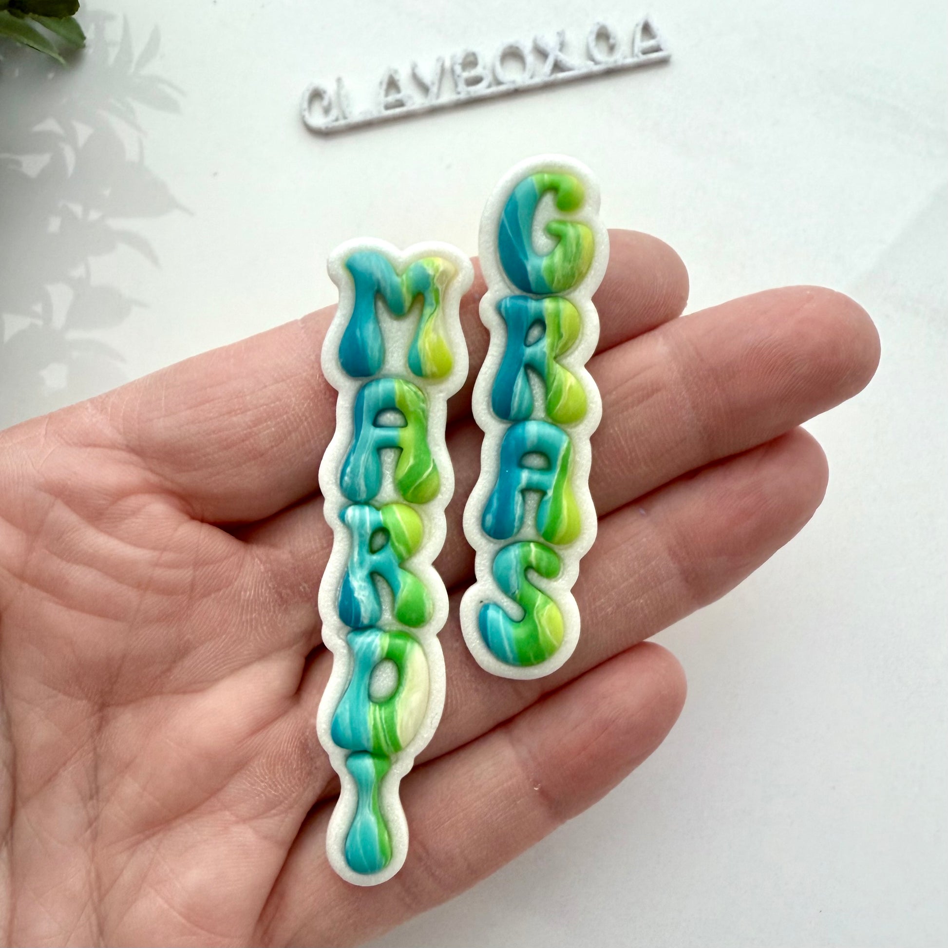 Celebrate in style with this Mardi Gras Cutter Set designed for polymer clay! This set includes cutters for creating the words “Mardi” and “Gras” with a unique layered design.
