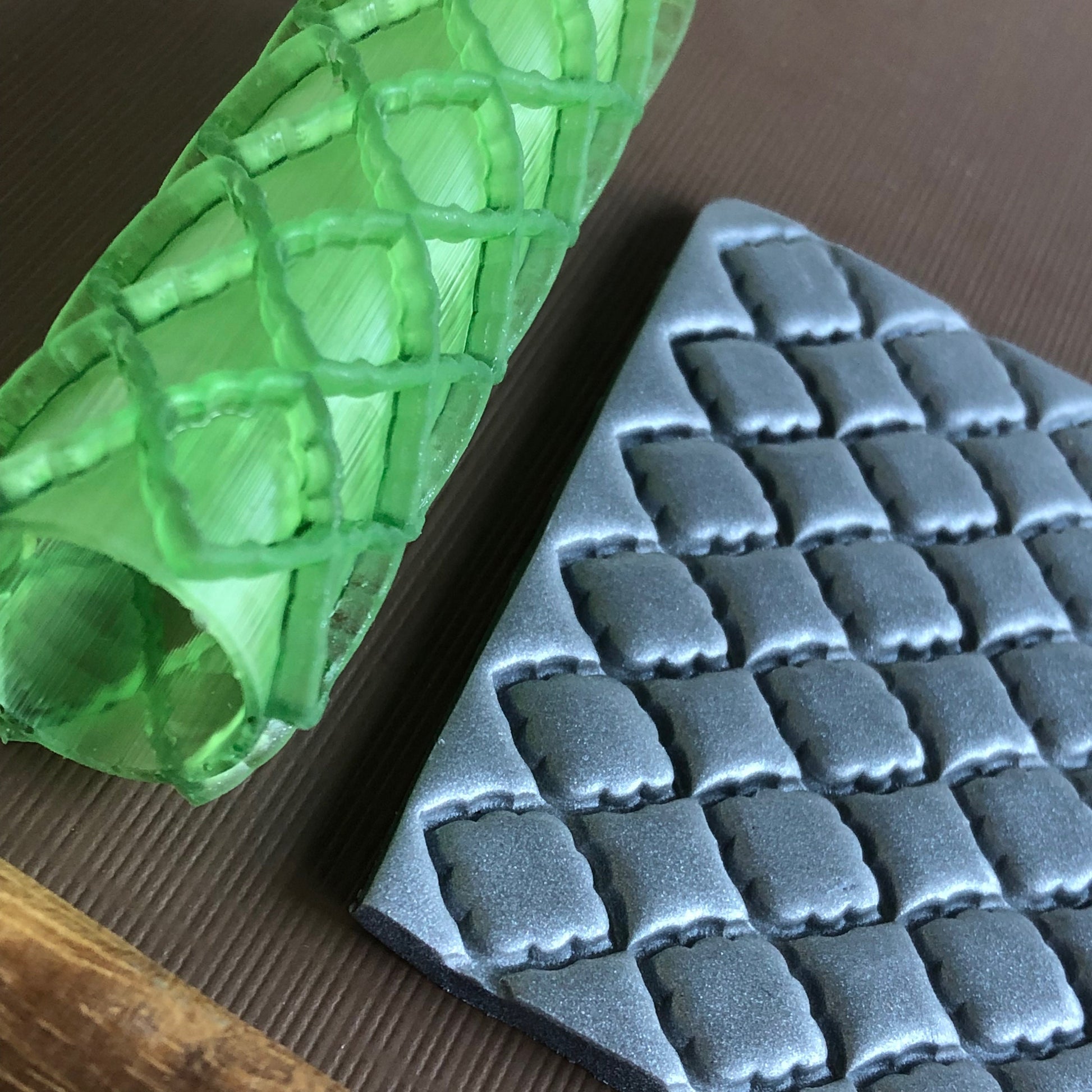 Using the same shape as our popular Moroccan shape cutters, this is a roller designed to make an imprint in polymer clay. Printed with a 3D printer the design is 2mm deep for a good impression. The roller is 6cm tall and approx 2cm wide.