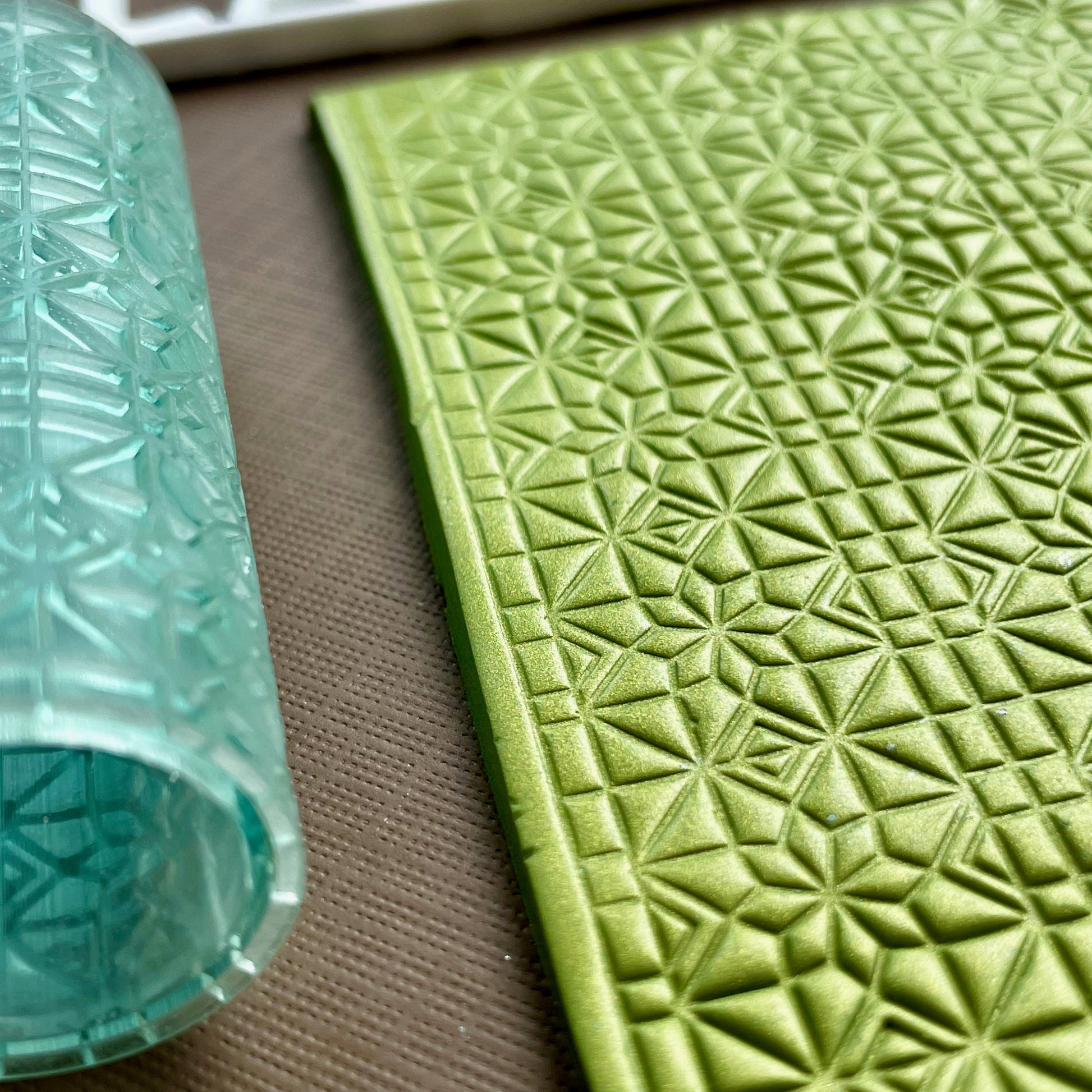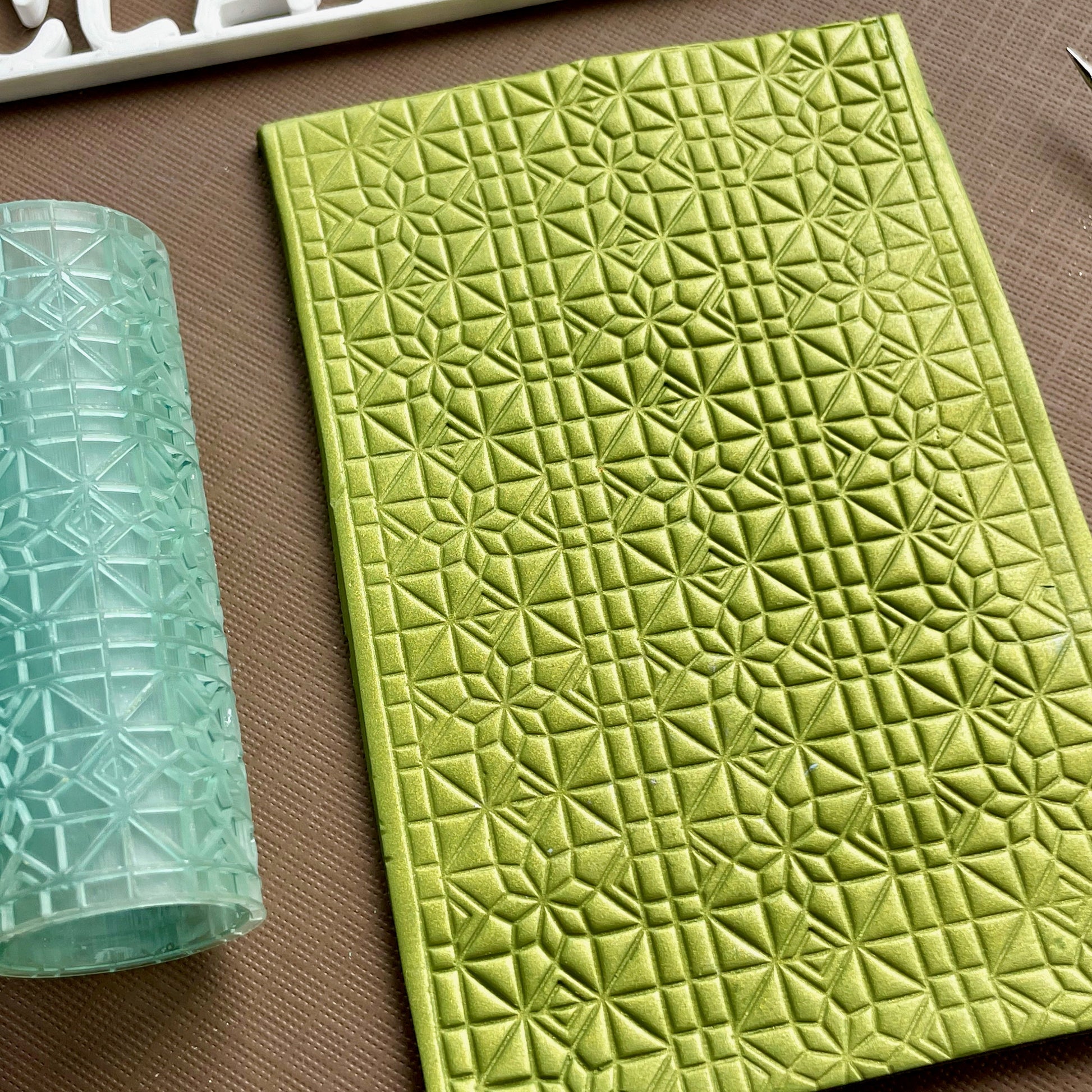 This is a roller designed to make an imprint in polymer clay. Printed with a 3D printer the design is 1.2mm deep. The roller is 5.5cm tall and approx 2cm wide.