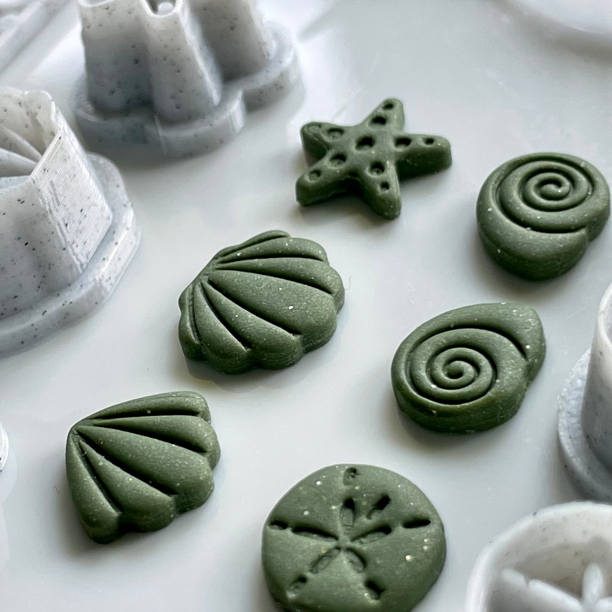 This is a set of six small cutters designed specifically for making stud earrings. Slightly shallower than our normal stamp/cutters, these work well with 2.5mm clay (#3 on Atlas pasta machine)